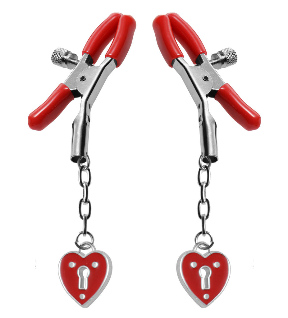 These easy to use clamps have a simple screw-down design, accented with heart shaped padlock detailing. The vinyl coated tips allow for a comfortable and secure grip while the red lacquered heart accent dangles enticingly from the end. The screws on the sides allow you to control just how much pressure your partner receives.