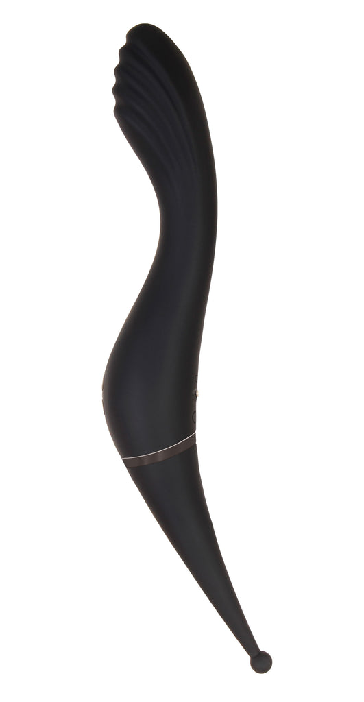 Double your pleasure with this dual-function vibe that delivers pin-point precision on one end and a textured G-spot experience on the other. Discover pure clitoral bliss with the deliciously round tip of the powerful tail and explore deep internal joy with the curved and flexible head thats designed with grooves to specifically tickle the G-spot. Each 10-speed motor operates separately with convenient controls at the midpoint, even under water as its completely submersible.