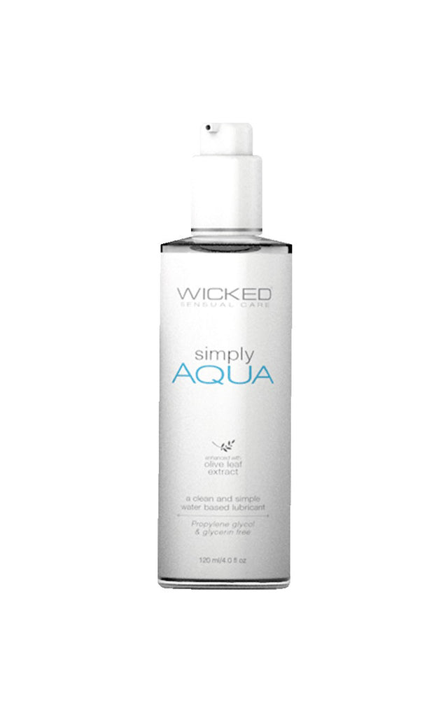 Heighten sensation and increase pleasure with Simply Aqua, a clean, pH balanced water based lubricant that's slick, sensual, and never sticky. Free of Glycerin, Propylene Glycol, and Parabens, Simply Aqua is also vegan, cruelty- free, and enhanced with Wicked's signature antioxidant-rich Olive Leaf Extract for its moisturizing and biostatic properties. When you want a clean lube...do it simply.