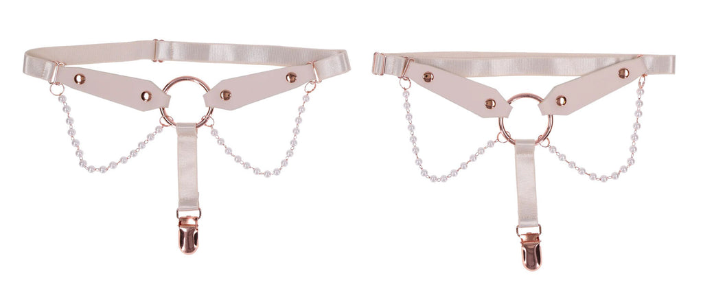 Sweet, sexy, and impossible to ignore, these luscious Peaches N CreaMe Garters are made to turn heads and raise pulses. Crafted from soft faux leather and adorned with delicate pearl strands, a gleaming rose gold O Ring, and functional garter clips, they blend elegance with irresistible edge. Fully adjustable for a perfect fit, they wrap your thighs like a sensual secret, tempting anyone within view to take a closer look or a daring bite. The secure clips hold your thigh highs in place, letting you strut with confidence and command attention at every step. Seduce with style, tease with power, once they catch a glimpse, theyll follow your lead without question.